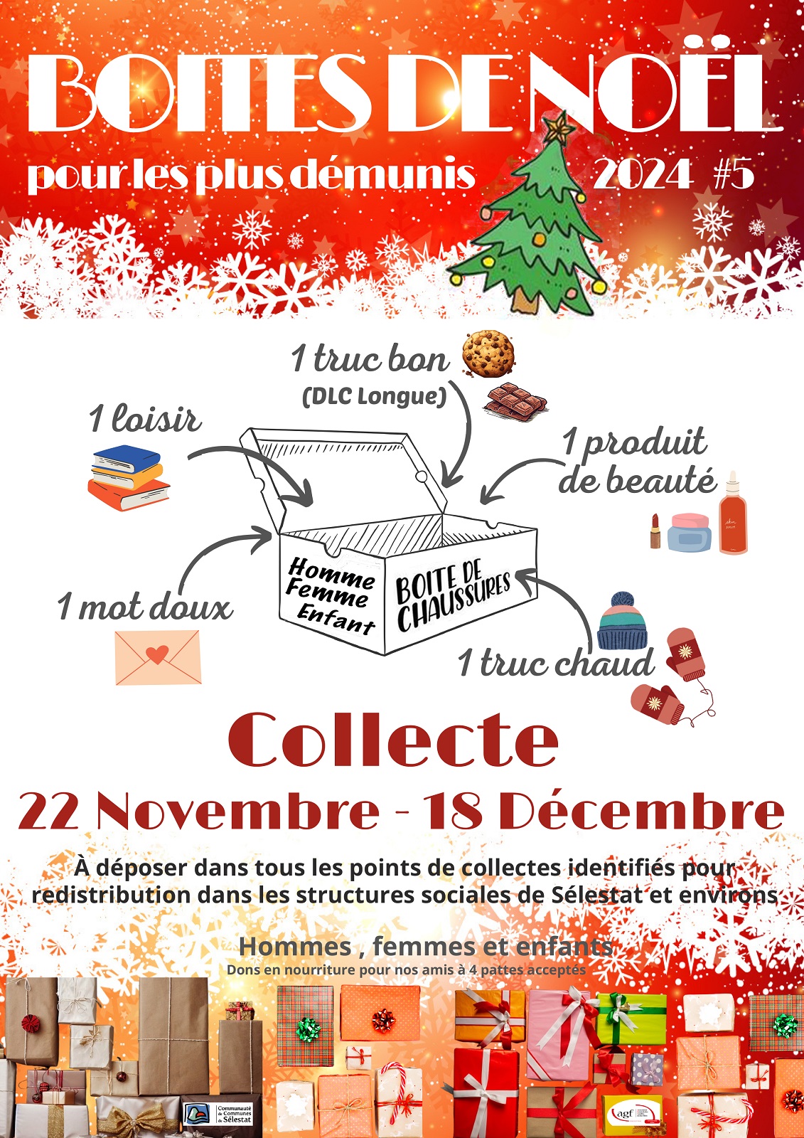 Du 22 novembre au 18 décembre 2024, déposez la ou les boites que vous aurez confectionnées dans l’un des trois points de collecte : en mairie, chez le coiffeur Sigrist ou dans les écoles Krafft, Les Bains et Hahnenberg.