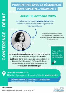 Rendez-vous le 16 octobre à 20h dans la Salle des Synergies, 4, rue des Tilleurs à Muttersholtz pour explorer ensemble les défis de la participation citoyenne !