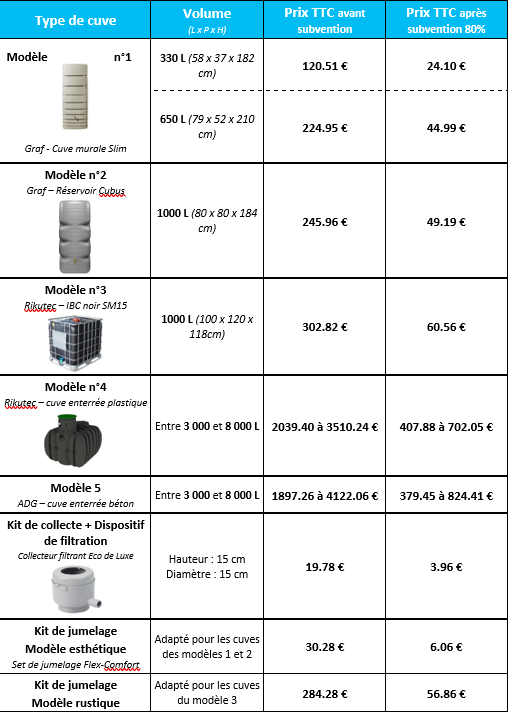 En effet, elle vous permet de bénéficier d’une aide subvention à hauteur de 80 % pour l’acquisition de cuves de récupération d’eau de pluie et de leurs équipements, parmi différents modèles, selon vos besoins. Cette subvention vous est proposée à la condition du déraccordement du réseau d’assainissement d’une partie des eaux pluviales issues de votre toiture. Le trop-plein de la cuve est infiltré sur votre terrain, permettant à l’eau de pluie de réintégrer le cycle naturel de l’eau et ainsi de recharger la nappe.