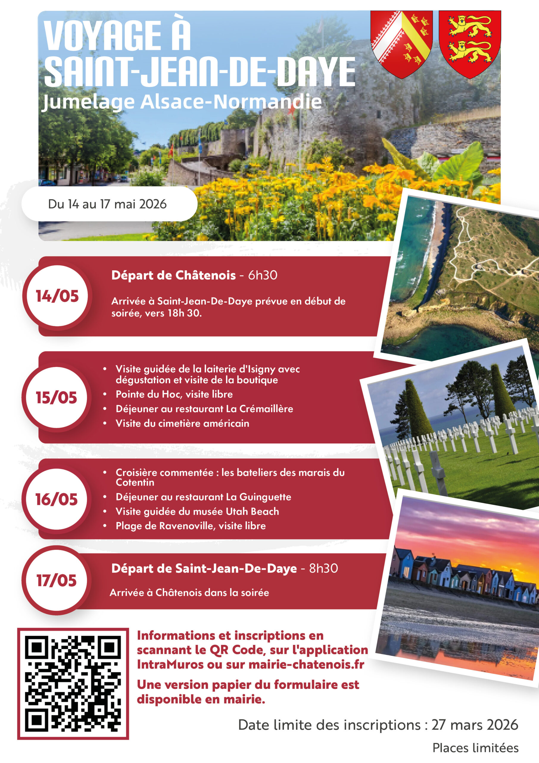 Suite à l’accueil des Normands de la région de Saint-Jean-de-Daye à Châtenois au mois de juin 2025, la commune de Châtenois organise un voyage retour durant le weekend de l’Ascension du 14 au 17 mai 2026.